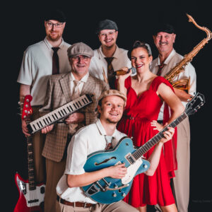 Fünf Vollblutmusiker (Git, Bass, Drums, Keys, Sax) und ihre Lady ...